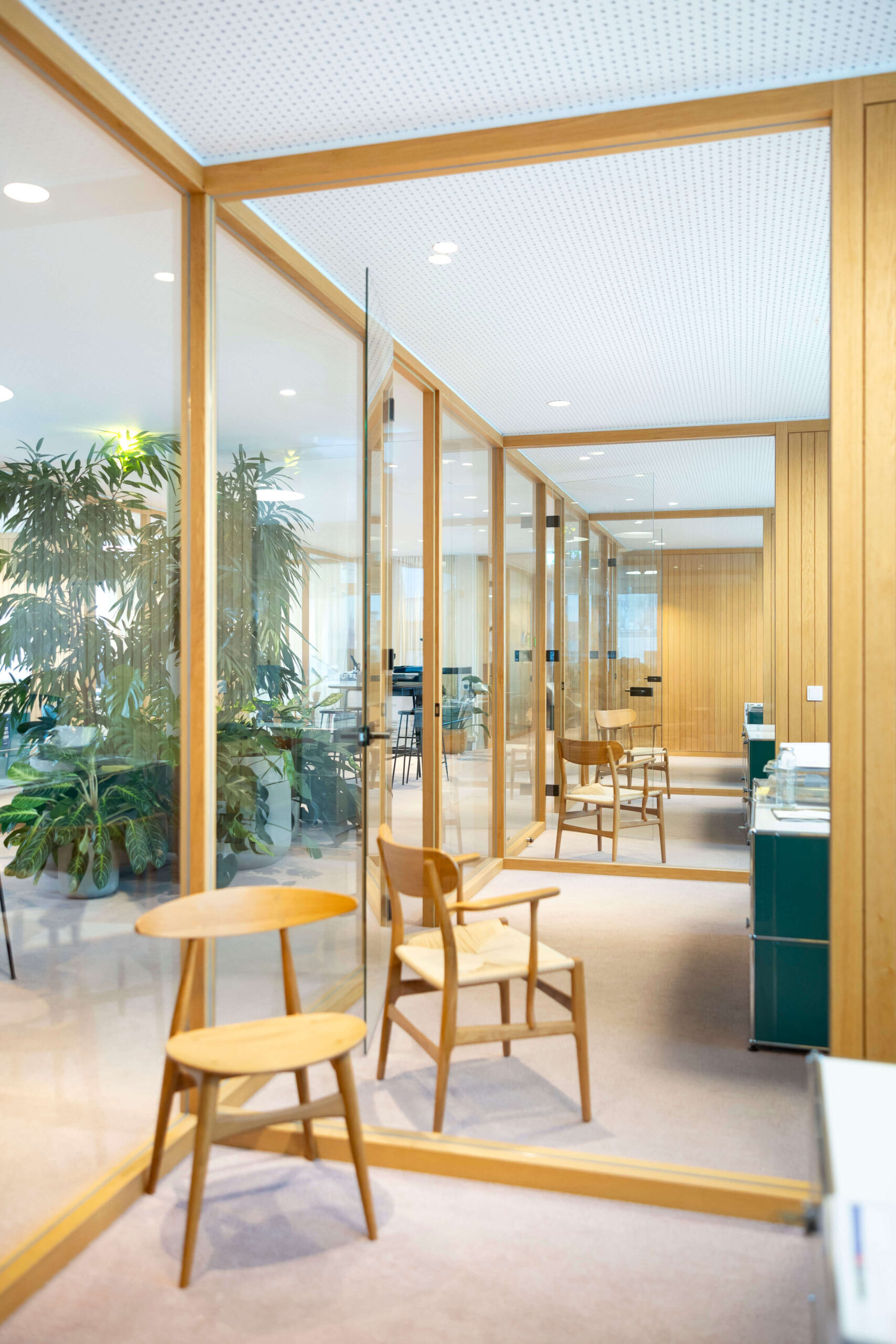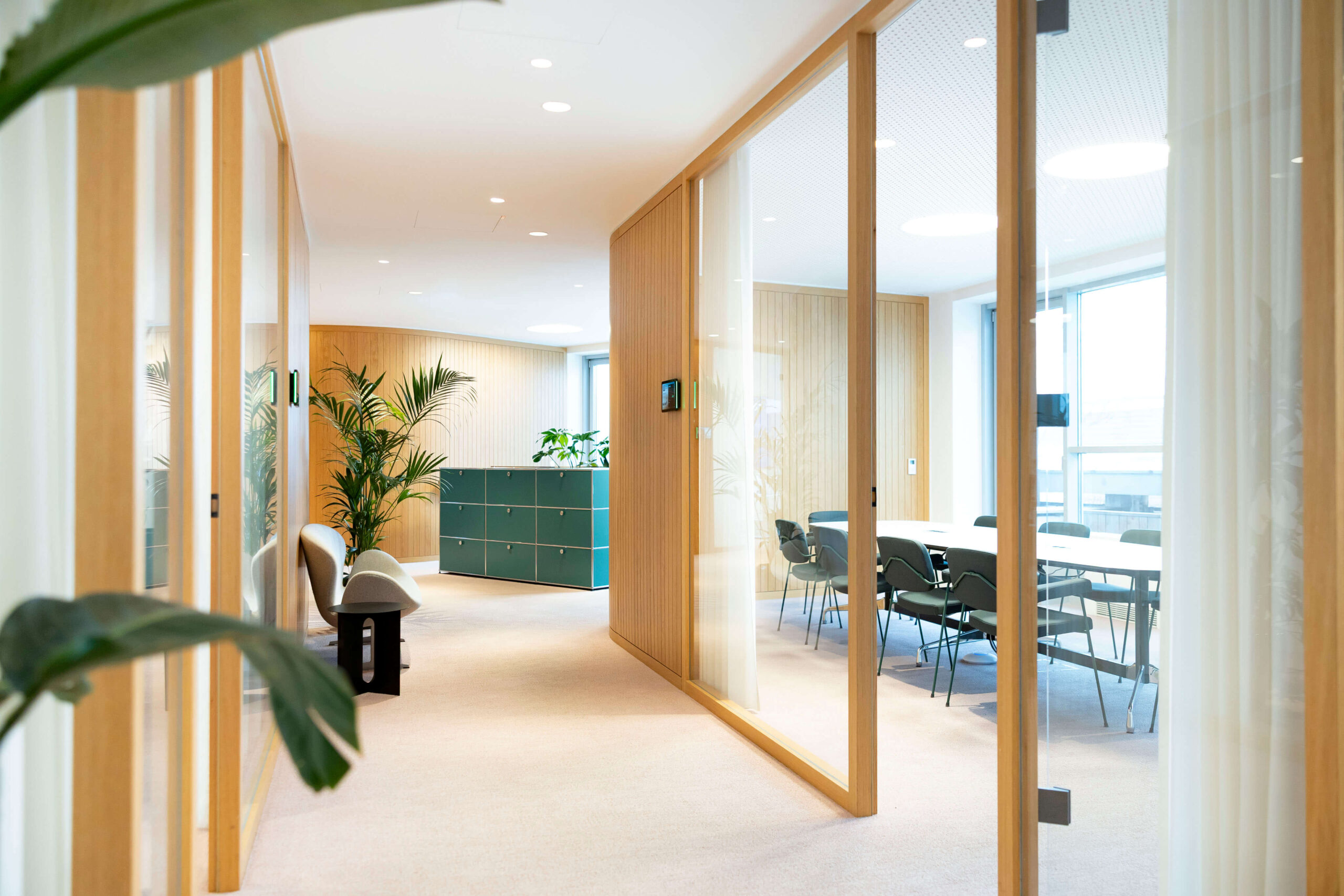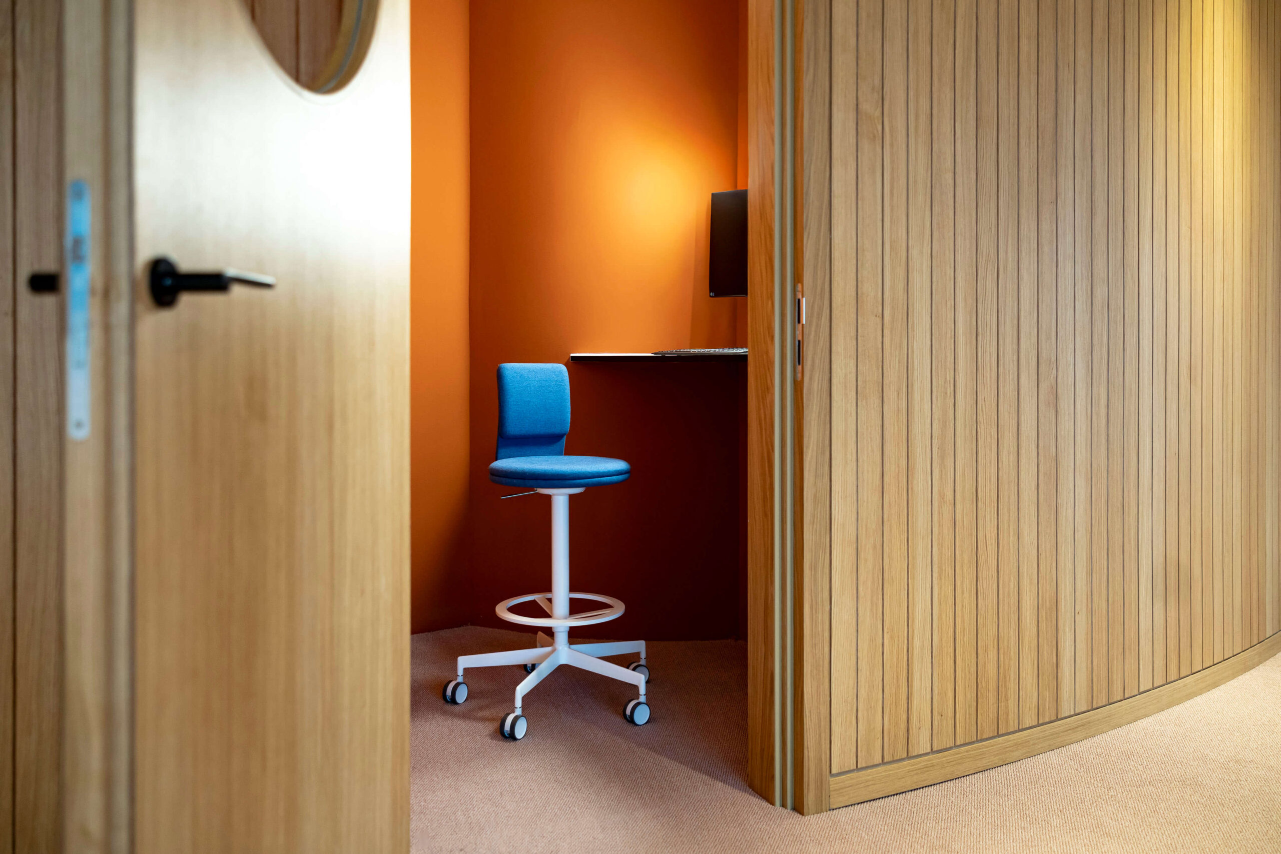 Die im Zuge der Büroerweiterung und Komplettsanierung neu geschaffene untere Ebene versammelt nunmehr alle Bereiche der internen Nutzung. Neben sämtlichen Arbeitsplätzen befinden sich hier insbesondere auch betont behaglich gestaltete Räume für fokussiertes Arbeiten genauso wie für Videocalls, Coachings und Teambesprechungen. In der Fortführung des freundlichen Farb- und Möbelkonzepts bietet die Etage somit nicht nur unterschiedliche optisch ansprechende Arbeitsumfelder, sondern schafft durch sanft in den Raum integrierte Holz- und Glastrennwände sowie entsprechend ausgestaltete Decken und Teppichböden wiederum auch akustisch optimierte Büroumgebungen.