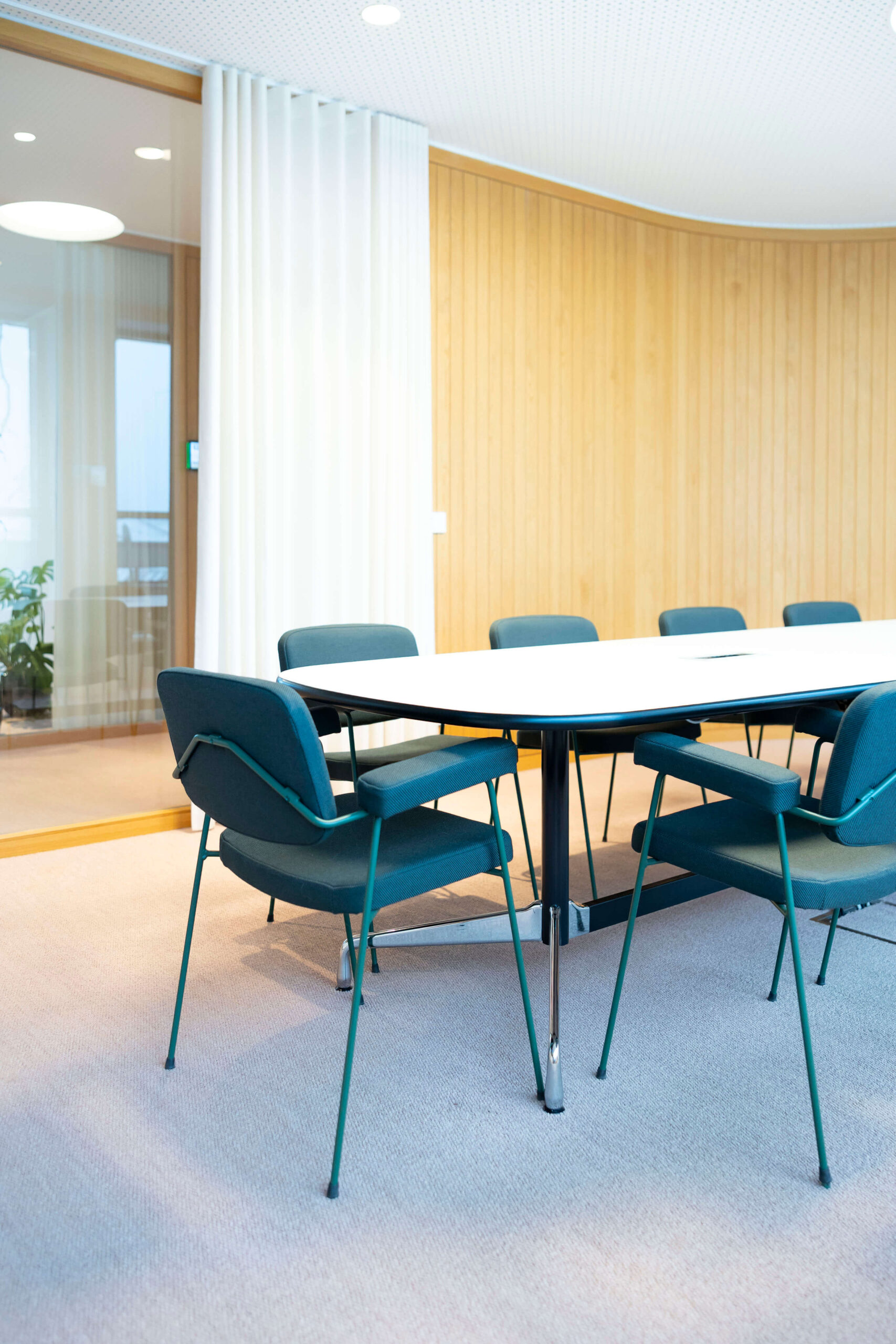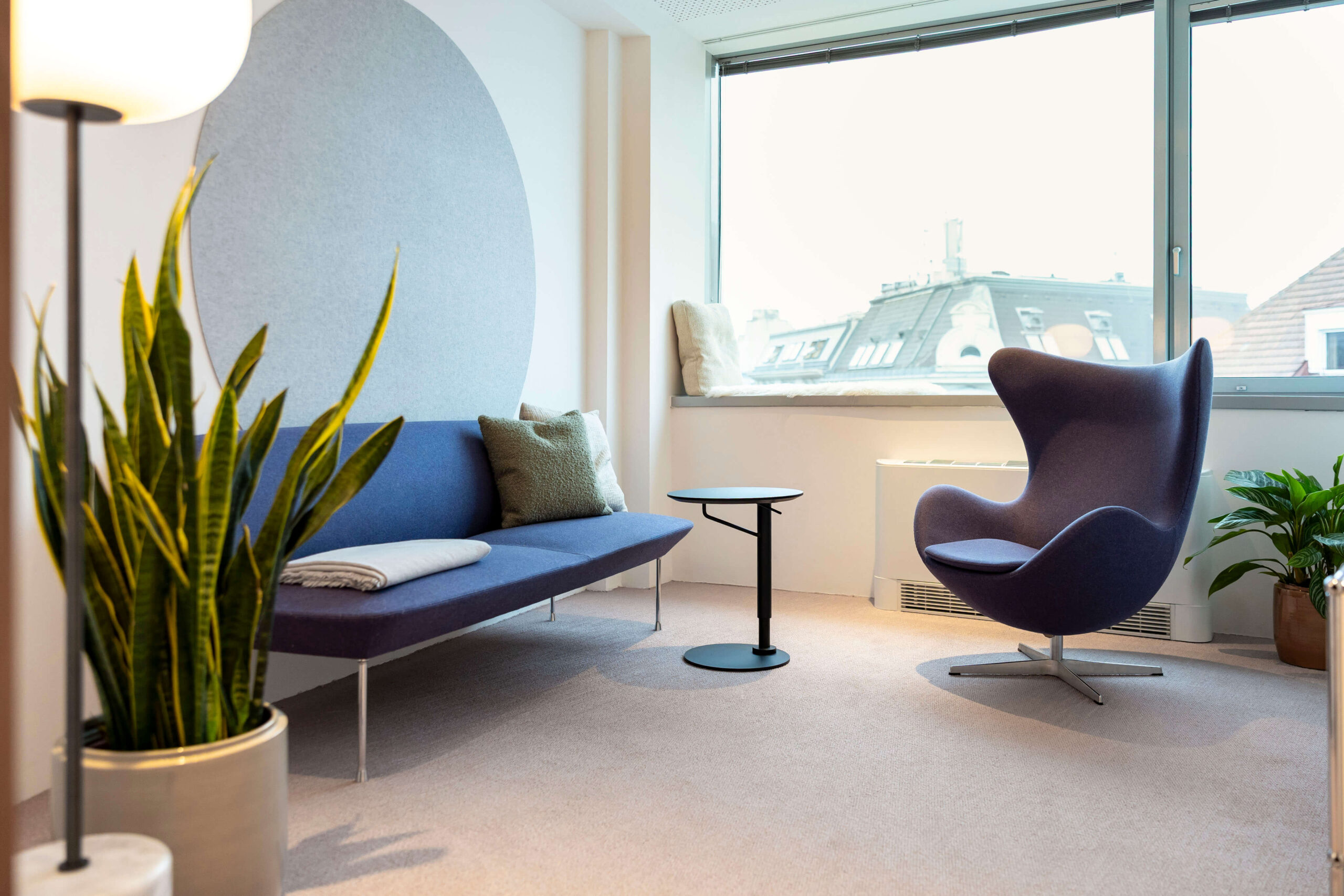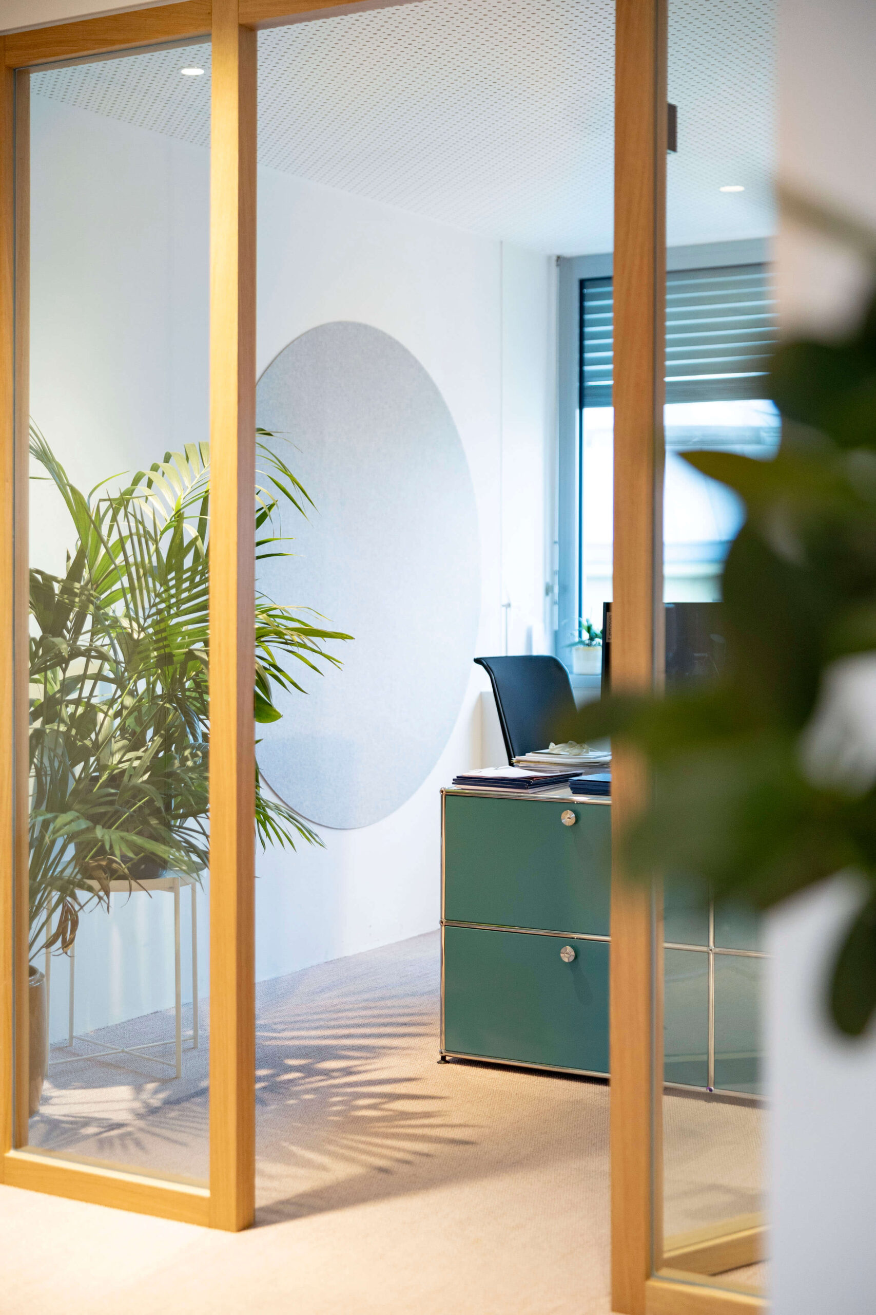 Die im Zuge der Büroerweiterung und Komplettsanierung neu geschaffene untere Ebene versammelt nunmehr alle Bereiche der internen Nutzung. Neben sämtlichen Arbeitsplätzen befinden sich hier insbesondere auch betont behaglich gestaltete Räume für fokussiertes Arbeiten genauso wie für Videocalls, Coachings und Teambesprechungen. In der Fortführung des freundlichen Farb- und Möbelkonzepts bietet die Etage somit nicht nur unterschiedliche optisch ansprechende Arbeitsumfelder, sondern schafft durch sanft in den Raum integrierte Holz- und Glastrennwände sowie entsprechend ausgestaltete Decken und Teppichböden wiederum auch akustisch optimierte Büroumgebungen.