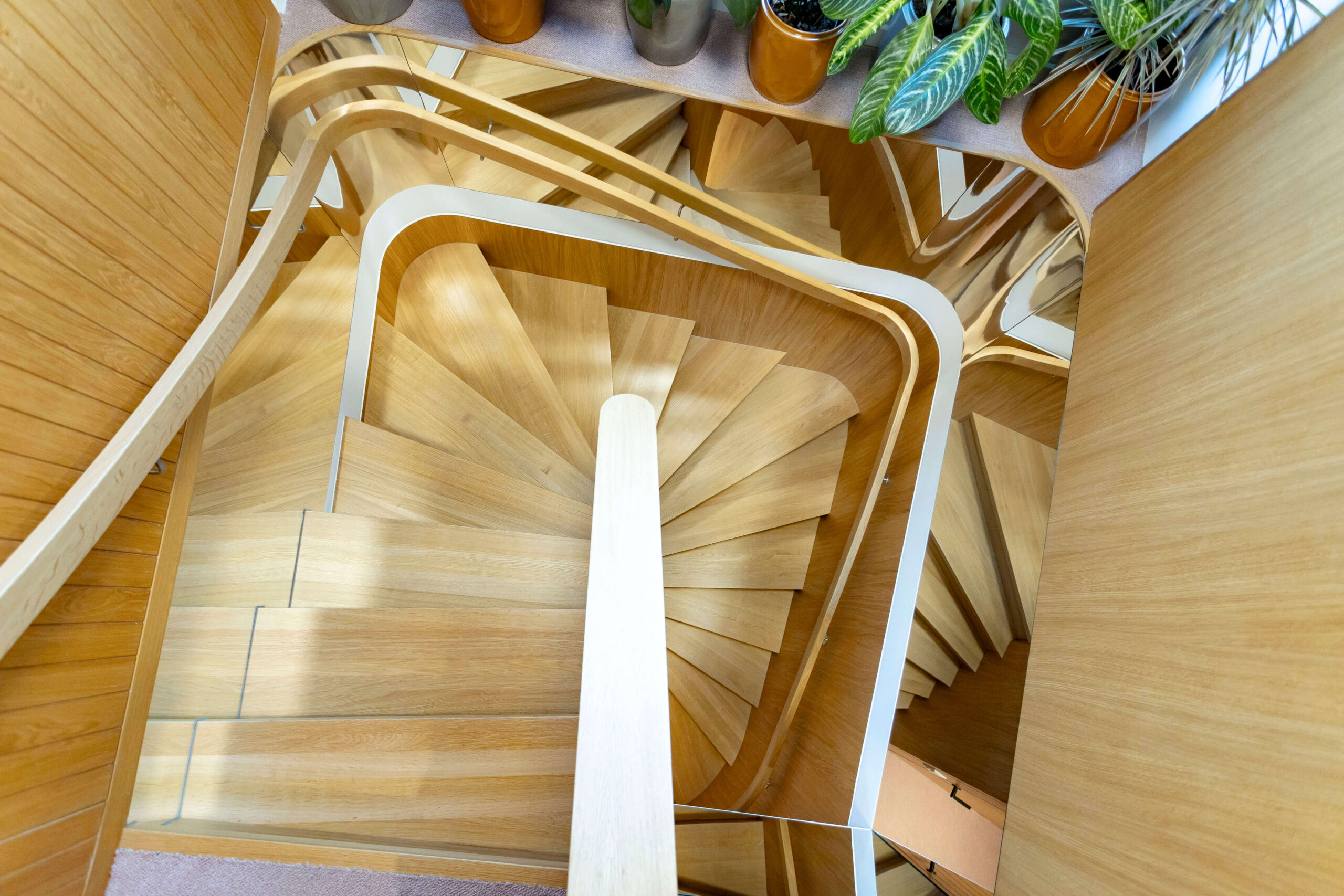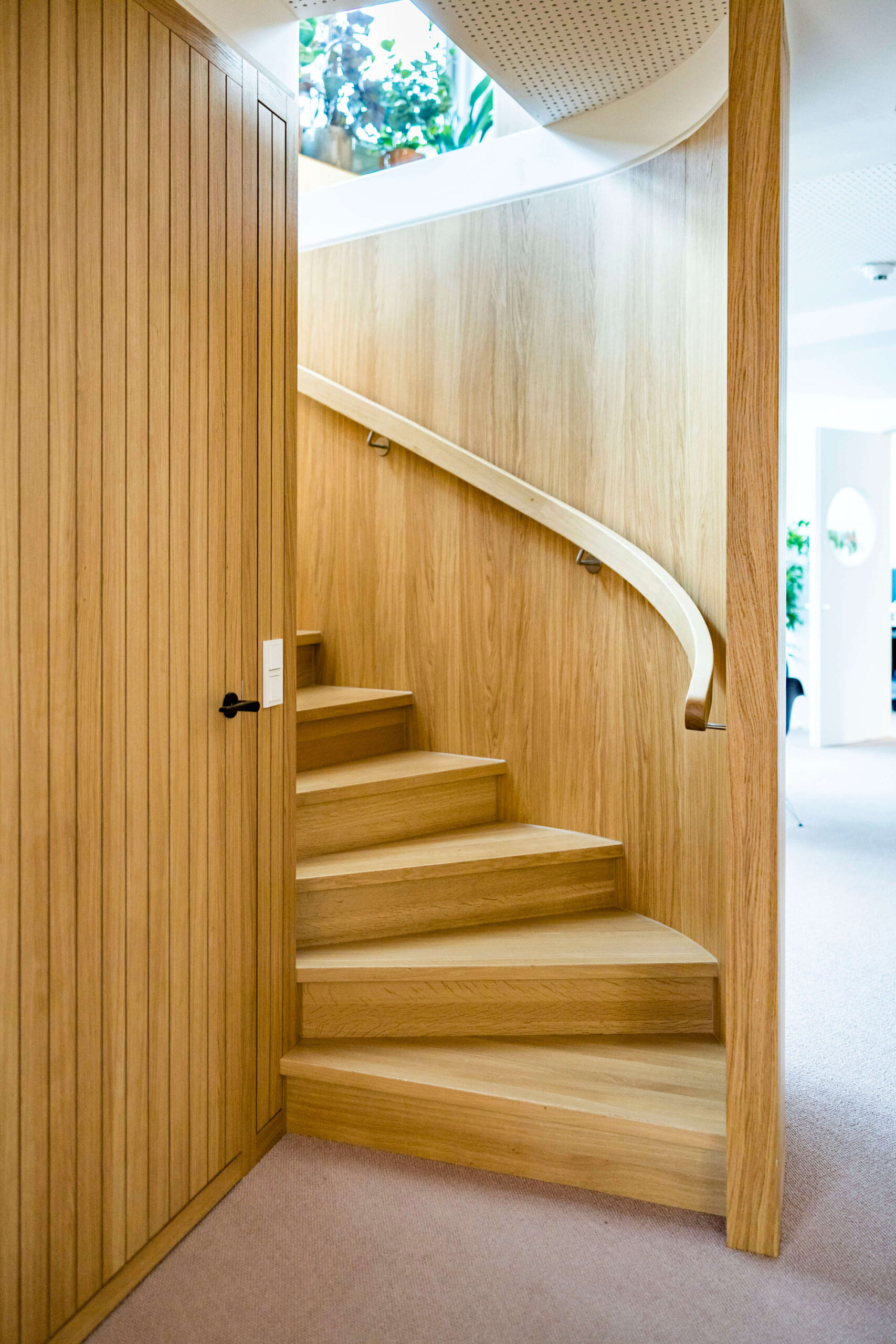 Die zentral im Empfangsbereich verortete neue Stiege dient als interne Verbindung der beiden Bürobereiche, wobei der Gästeempfang ausschließlich im Obergeschoß erfolgt, in dem auch sämtliche Konferenzräume situiert sind. Eine Etage darunter befinden sich Büroflächen, interne Besprechungsräume, Fokusboxen sowie die Buchhaltung und Rechtsabteilung des Unternehmens. Gezielt eingesetzte Spiegel ermöglichen trotz der geringen Breite der Stiege den Sichtkontakt mit entgegenkommenden Personen. Gleichzeitig erzeugen sie eine subtile räumliche Wirkung und lassen die Deckenstärke optisch schlanker erscheinen. In Verbindung mit der indirekten Treppenbeleuchtung setzt die neue Stiege so einen sehenswerten neuen Akzent im Sinne des konsequenten Material- und Raumkonzepts von KENH.