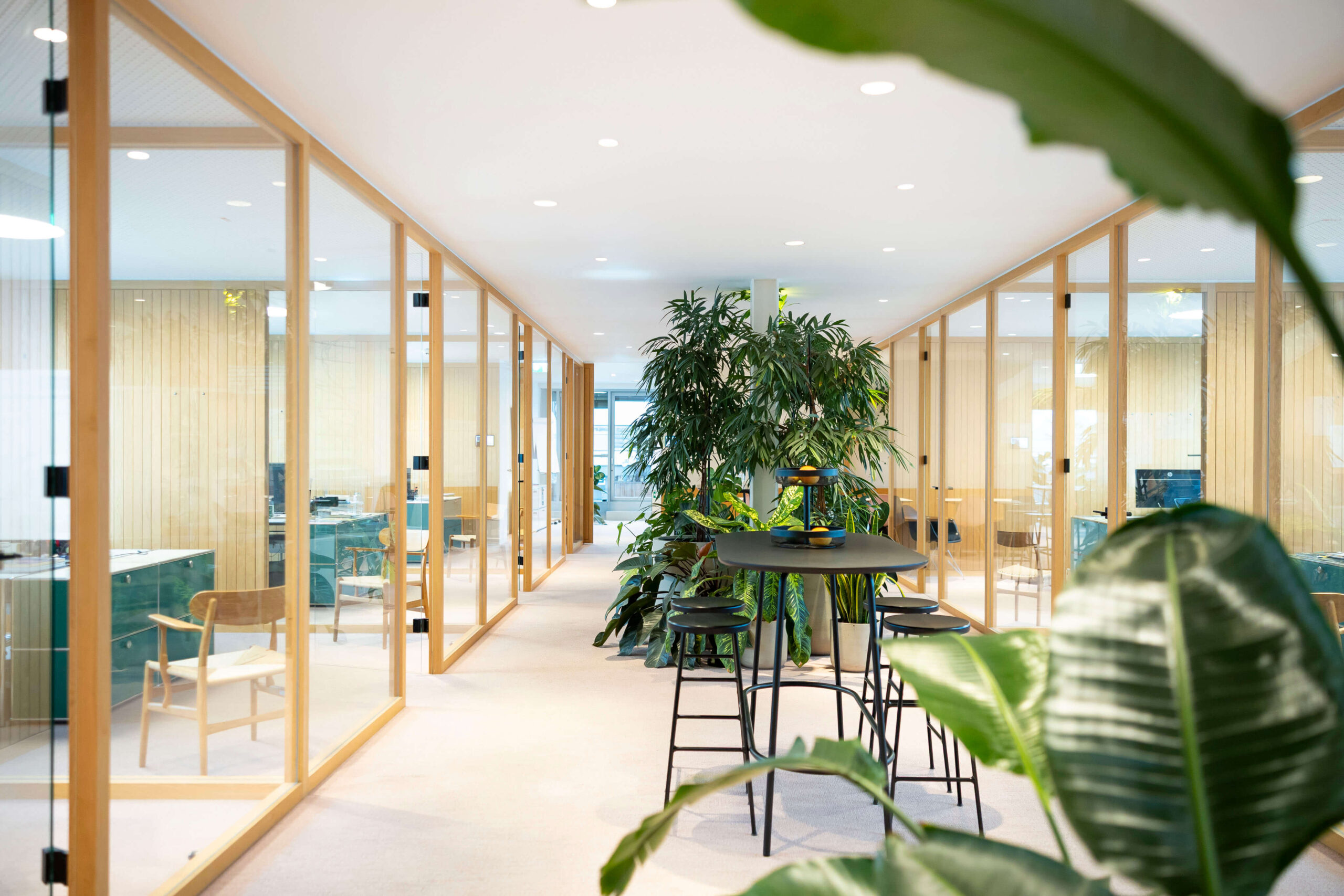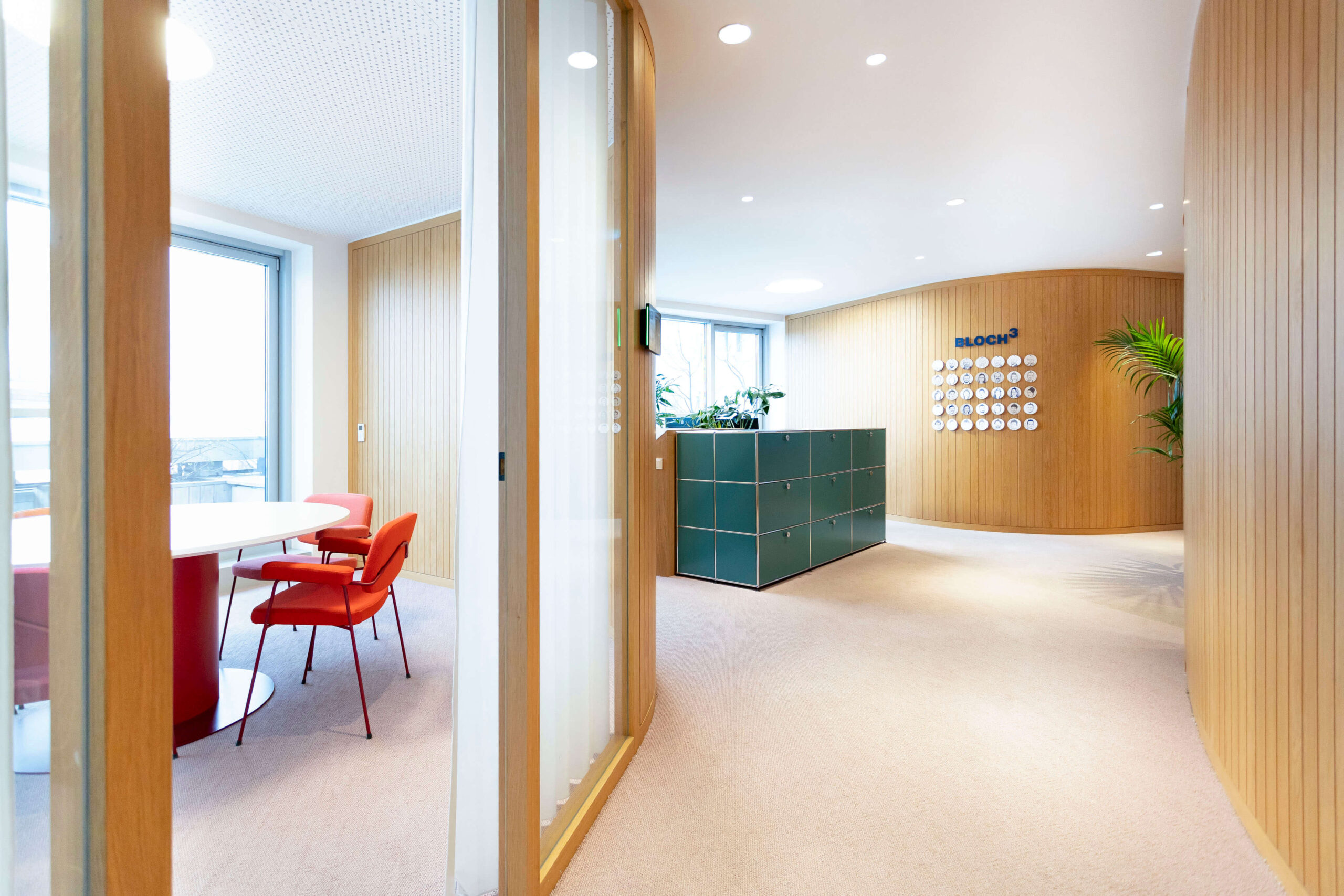 Aus einer werden zwei: Nach dem erfolgreichen Umbau der Büroräumlichkeiten von Ventureal im Jahr 2022 ergab sich ein Jahr später die Möglichkeit, diese um die darunterliegende Etage zu erweitern – ein Schritt, der auch aufgrund des starken Unternehmenswachstums und der damit einhergehenden Teamvergrößerung dringend notwendig wurde. In der Fortsetzung des klaren Gestaltungskonzepts von KENH sollte die neue Ebene dabei nicht nur über eine platzsparend eingepasste Massivholztreppe an die bestehenden Räumlichkeiten angebunden, sondern sämtliche Bereiche entlang ihrer Nutzung außerdem umfassend neu organisiert werden. Teil des Projekts, das darüber hinaus mit der Umbenennung des Unternehmens von Ventureal auf BLOCH 3 zusammenfiel, war zudem ein ganzheitliches Bepflanzungskonzept von Calienna für beide Etagen, neue Bestuhlung für die Meetingräume sowie eigens entworfene Tische mit dezent integrierten Steckplätzen für die kleineren Besprechungseinheiten.