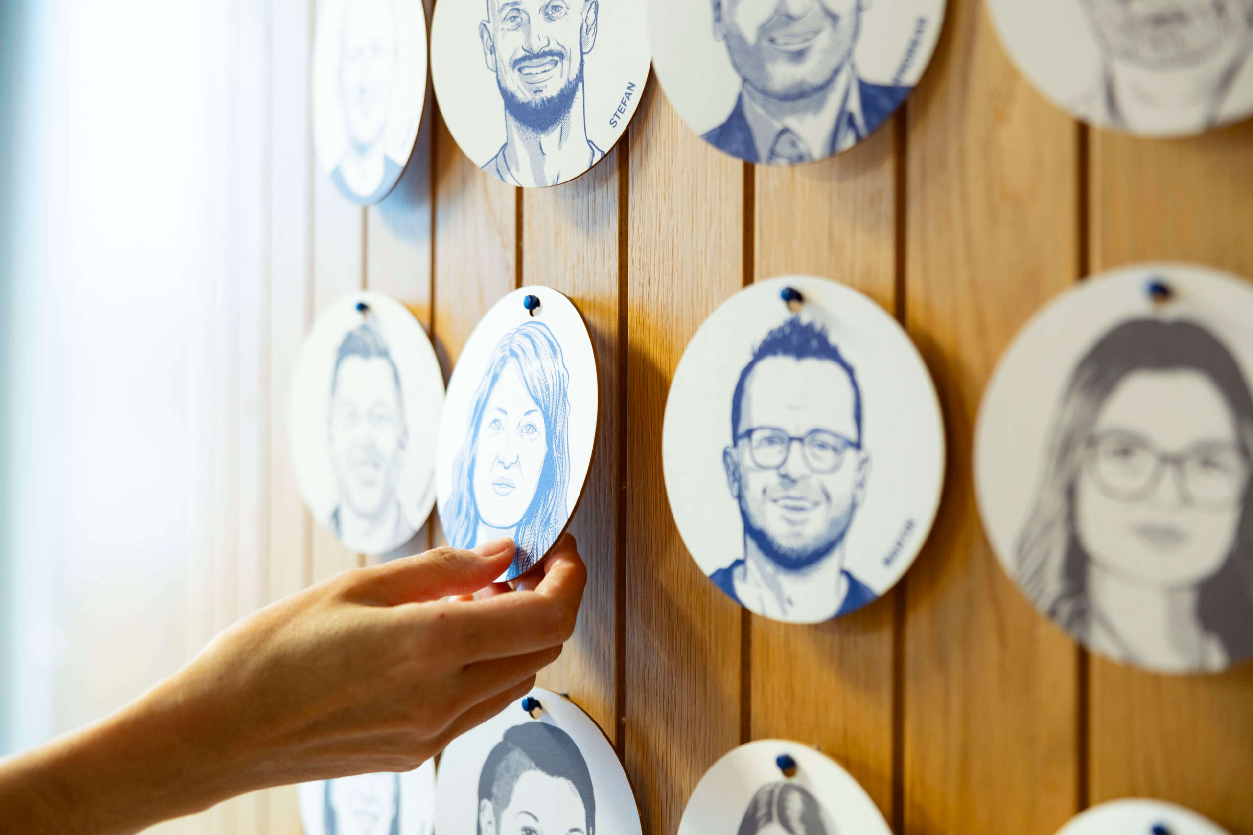 Die neue Rezeption fungiert als zentraler Identifikations- und Orientierungspunkt des Unternehmens. Eine Anwesenheitsdarstellung mit handgezeichneten Mitarbeiter:innenporträts verleiht dem Empfangsbereich nicht nur eine persönliche Note, sondern unterstreicht darüber hinaus die Idee von Zugehörigkeit und Zusammenhalt. Auf einfache Weise wird hier die Präsenz der Mitarbeitenden visualisiert: Blau steht für anwesend, Grau für out of office. Diese Geste der Sichtbarmachung vermittelt Wertschätzung nach innen und stärkt das Gemeinschaftsgefühl, ohne die einzelne Person in den Hintergrund zu rücken. Gleichzeitig geben die von Thuan Nguyen Tien illustrierten Wendeplaketten den Besucher:innen von BLOCH 3 einen Eindruck von der Größe und Struktur des Unternehmens.